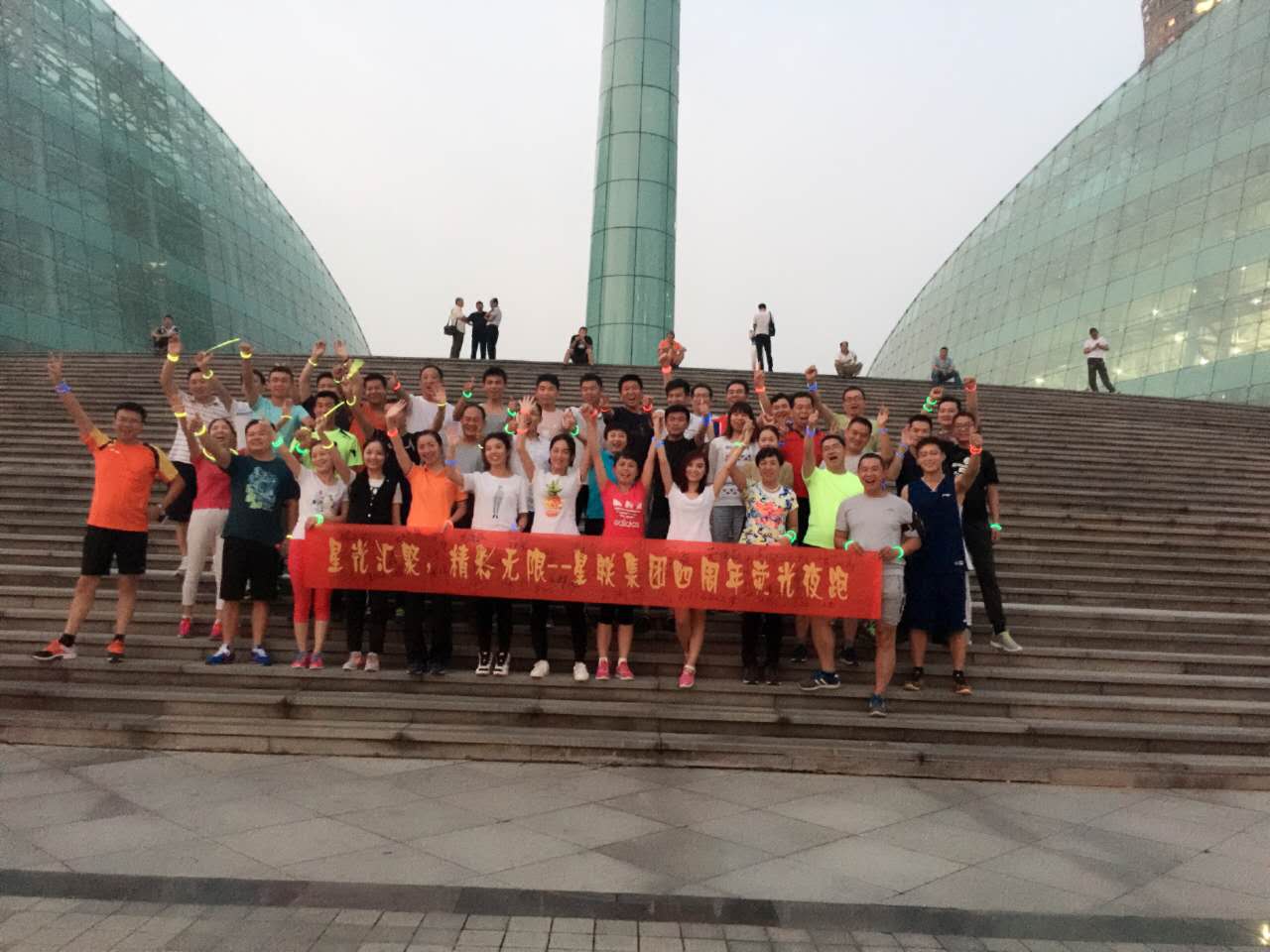 8月26日晚,星聯(lián)集團(tuán)在鄭東新區(qū)CBD開展“熒光夜跑”活動(dòng)。此次活動(dòng)為慶祝星聯(lián)集團(tuán)成立四周年,并倡導(dǎo)健康的生活方式。活動(dòng)由集團(tuán)行政管理中心組織,40余名星聯(lián)集團(tuán)員工參與。