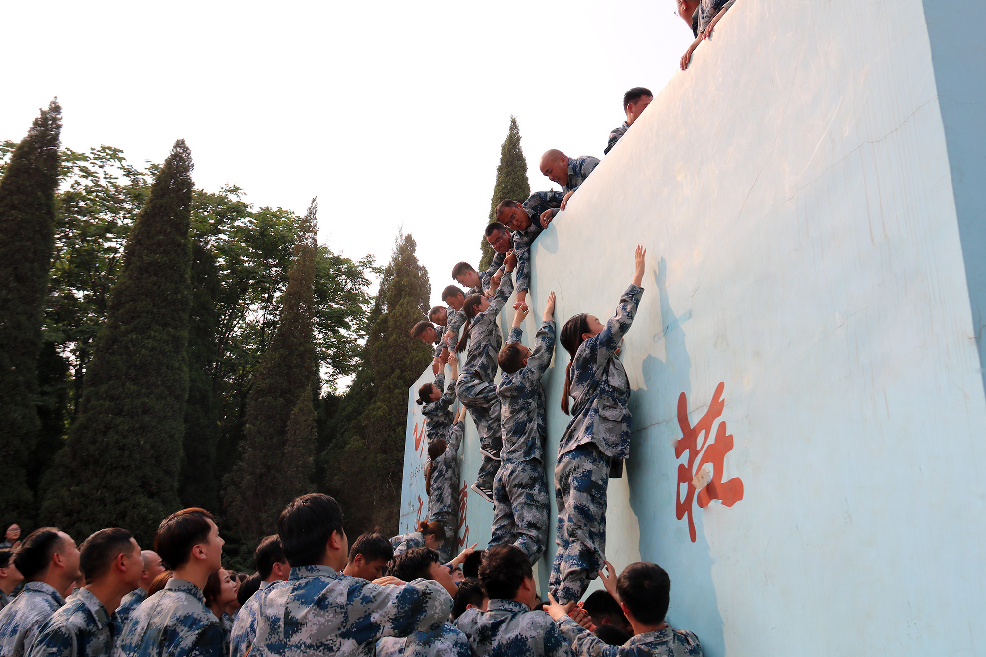 4.2米的畢業墻,考驗著學員的團結與合作,所有學員萬眾一心,眾志成城,默默付出的“基樁”、“援手”、“推手”,不拋棄任何一個成員,不放棄任何一種可能。37度的熾熱抹不去大家心中的拼勁,化不去心中的激情,12分55秒的成績讓教練也為學員歡聲喝彩。