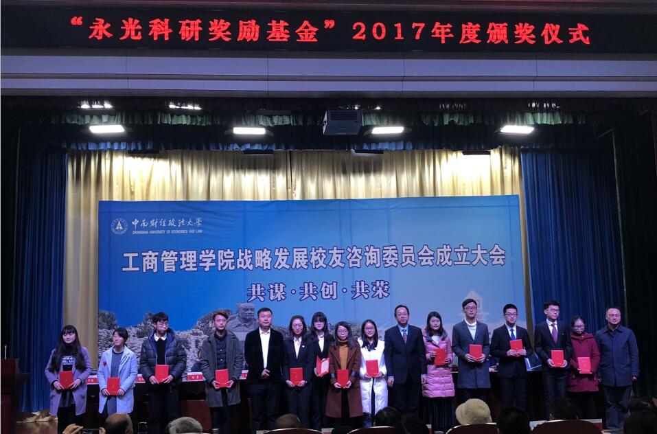 2017年12月23日,“永光科研獎勵基金”2017年度頒獎儀式在武漢市中南財經政法大學文譚報告廳隆重舉行,我公司董事長王永光先生向獲獎的優秀老師和學生頒發了獎金。