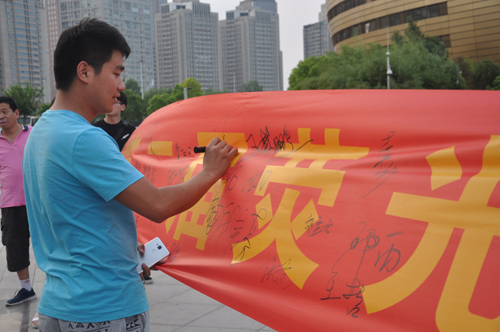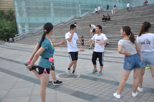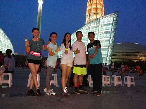 結束一天緊張工作,小伙伴們齊聚河南藝術中心廣場, 紛紛在條幅上簽下自己的名字。一番熱身運動過后,已是華燈初上。大家佩戴上不同顏色的熒光棒,開始蓄勢待發(fā)。